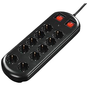 Zum Anschluss von zehn elektrischen Geräten, die über zwei Gruppen geschaltet werden können: zwei beleuchtete Schalter für je fünf Steckdosen
