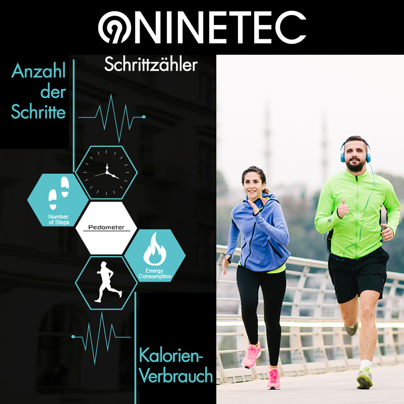 - NINETEC Smartfit Fitnesstracker mit Anzeige von Uhrzeit, Schrittzähler und verbrannten Kalorien.