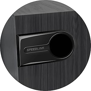 Der Bassreflexkanal im Gehäuse hat nicht nur eine stilvolle Öffnung mit Speedlink-Logo; im Bereich der untersten Oktave wird ein wesentlich höherer Schalldruckpegel erreicht. Dadurch, dass der Subwoofer auf Gummifüßen steht, wird der Schall zusätzlich noch vom Boden entkoppelt. Somit sollte es keine genervten Zimmer- oder Hausnachbarn mehr geben und der Sound kann sich bestmöglich in den eigenen vier Wänden entfalten.