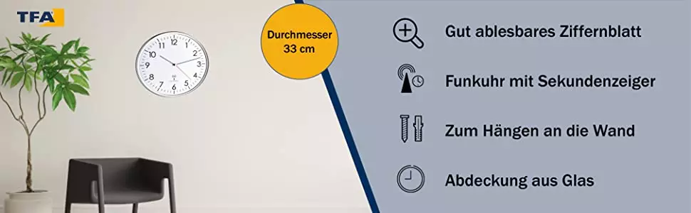 Die TFA Funk-Wanduhr empfängt die Uhrzeit über das DCF 77 Signal.